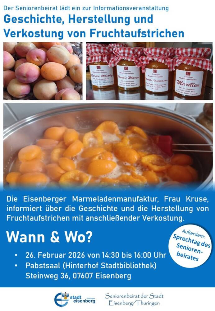 Die Eisenberger Marmeladenmanufaktur, Frau Kruse, informiert am 26. Februar 2026 im Pabstsaal über die Geschichte und die Herstellung von Fruchtaufstrichen mit anschließender Verkostung.