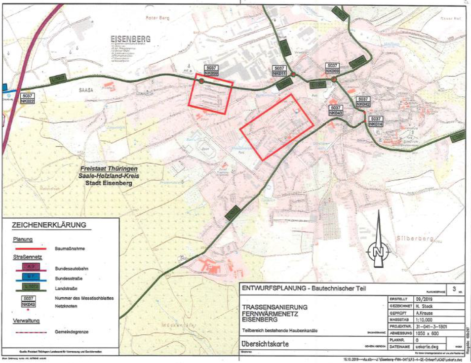 Mit dem Vorhaben werden vorhandene Leitungen und Hausanschlussstationen im Stadtgebiet von Eisenberg mit hohen Wärmeverlusten durch Kunststoffmantelleitungen mit Lecküberwachungssystem ersetzt. Die neuen Leitungen sind im Erdreich verlegt. Dadurch werden die Wärmeverluste stark reduziert.